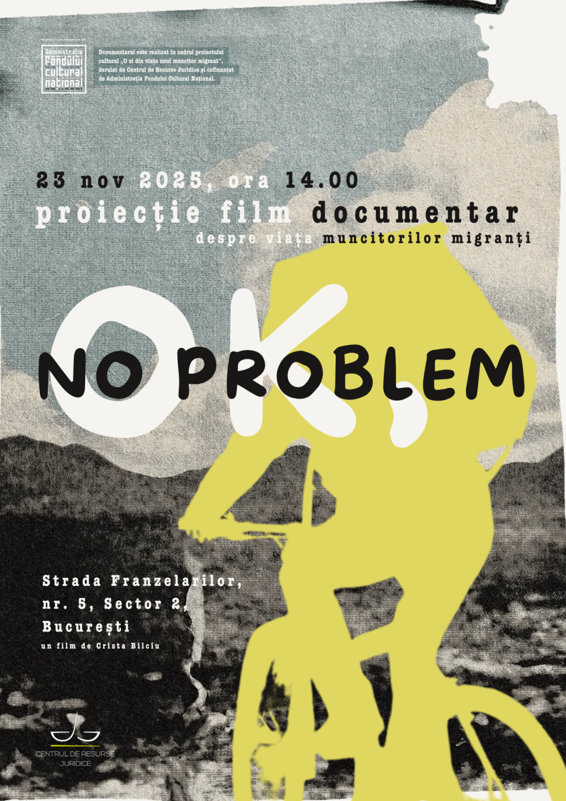 În a doua parte a zilei, publicul a vizionat versiunea ne-editată (2 ore) a documentarului „Ok, no problem”, realizat de CRJ în cadrul proiectului „O zi din viața unui muncitor migrant”. Filmul oferă acces direct la experiențele personale ale lucrătorilor migranți din România, surprinzând precaritatea condițiilor de muncă, barierele administrative, dependența față de angajator și realitatea emoțională a vieții trăite la distanță de familie. Nu mai puțin de 6 mărturii directe ale muncitorilor migranți, alături de 3 opinii ale unor persoane care lucrează în domeniul migrației, au reușit să contureze modul în care migrația se manifestă astăzi în societate, dar și care este răspunsul autorităților și altor actori responsabili.