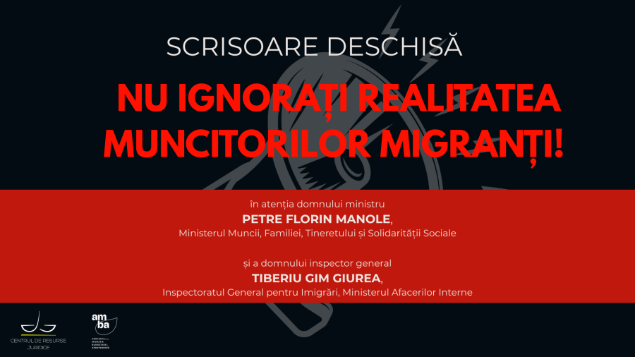 În atenția: Domnului ministru Petre Florin MANOLE, Ministerul Muncii, Familiei, Tineretului și Solidarității Sociale Domnului inspector general Tiberiu Gim GIUREA, Chestor de poliție, Inspectoratul General pentru Imigrări Scrisoare deschisă Nu ignorați realitatea muncitorilor migranți! Centrul de Resurse Juridice (CRJ) și Asociația pentru Migrație, Bunăstare și Apartenență (AMBA) ridică un semnal de alarmă cu privire la modificările … Continuă lectura SCRISOARE PUBLICĂ: Nu ignorați realitatea muncitorilor migranți!