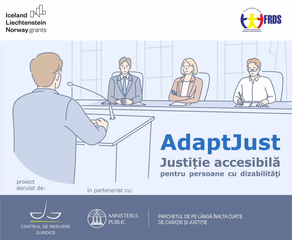 Proiectul AdaptJust este un proiect derulat de organizația Centrul de Resurse Juridice (CRJ) în parteneriat cu Ministerul Public – Parchetul de pe lângă Înalta Curte de Casaţie şi Justiţie.