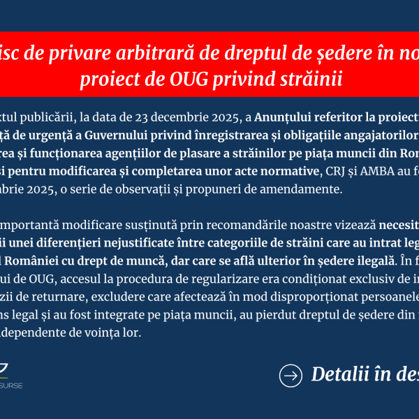 Risc de privare arbitrară de dreptul de ședere în noul proiect de OUG privind străinii (Amendamente CRJ și AMBA) 30.12.2025 - În contextul publicării, la data de 23 decembrie 2025, a Anunțului referitor la proiectul de Ordonanță de urgență a Guvernului privind înregistrarea și obligațiile angajatorilor străinilor, autorizarea și funcționarea agențiilor de plasare a străinilor pe piața muncii din România, precum și pentru modificarea și completarea unor acte normative, CRJ și AMBA au formulat o serie...