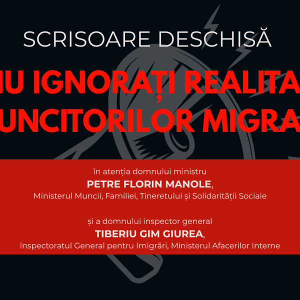 SCRISOARE PUBLICĂ: Nu ignorați realitatea muncitorilor migranți! 26.11.2025 - În atenția: Domnului ministru Petre Florin MANOLE, Ministerul Muncii, Familiei, Tineretului și Solidarității Sociale Domnului inspector general Tiberiu Gim GIUREA, Chestor de poliție, Inspectoratul General pentru Imigrări Scrisoare deschisă Nu ignorați realitatea muncitorilor migranți! Centrul de Resurse Juridice (CRJ) și Asociația pentru Migrație, Bunăstare și Apartenență (AMBA) ridică un semnal de alarmă cu privire la modificările...