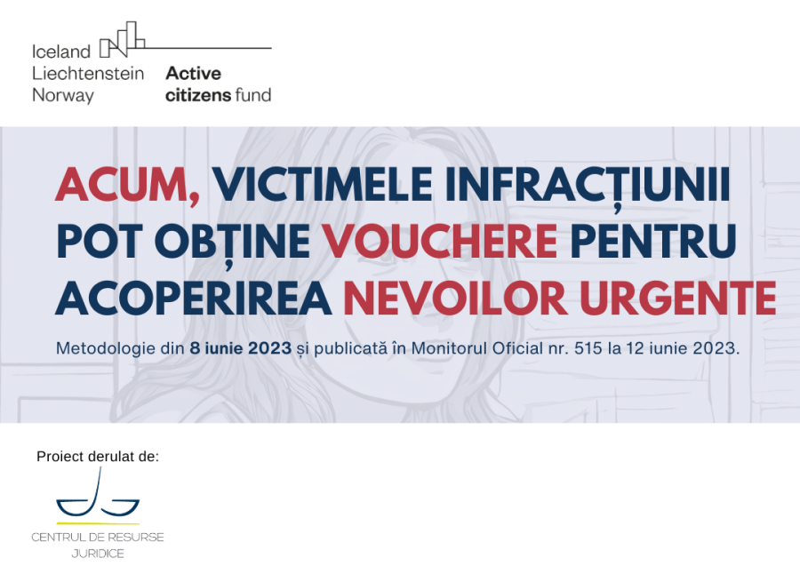 A fost adoptată Metodologia de emitere, distribuire și decontare a voucherelor destinate victimelor infracțiunii, pentru stabilirea cuantumului acestora, precum și a criteriilor de selectare a entităților publice și private înrolate în mecanismul de acordare, la data de 8 iunie 2023 și publicată în Monitorul Oficial nr. 515 la 12 iunie 2023. Această metodologie vine în … Continuă lectura Vouchere destinate victimelor infracțiunii